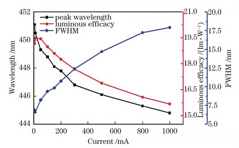 发光波长变化:随着注入电流的增加,LED的发光峰波长通常会向短波长方向移动,即发生蓝移。这种现象在InGaN/GaN多量子阱结构中尤为明显,主要归因于载流子对极化场的屏蔽效应以及能带填充效应。如图5所示,可见,在 5~1000mA的电流范围内,蓝光LED芯片的峰值波长由451.1nm 减小到444.8nm。