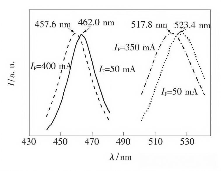 (图3 蓝(左)绿(右)LED蓝移量的差异)